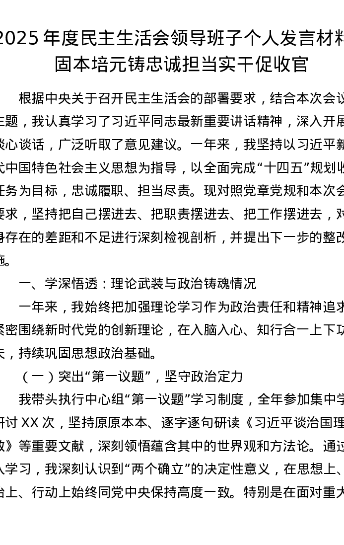 2025年度xxxxx领导班子个人发言材料:固本培元铸忠诚 担当实干促收官