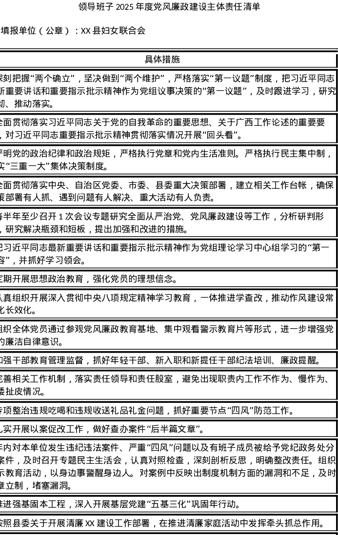 XX县妇女联合会领导班子2025年度党风廉政建设主体责任清单