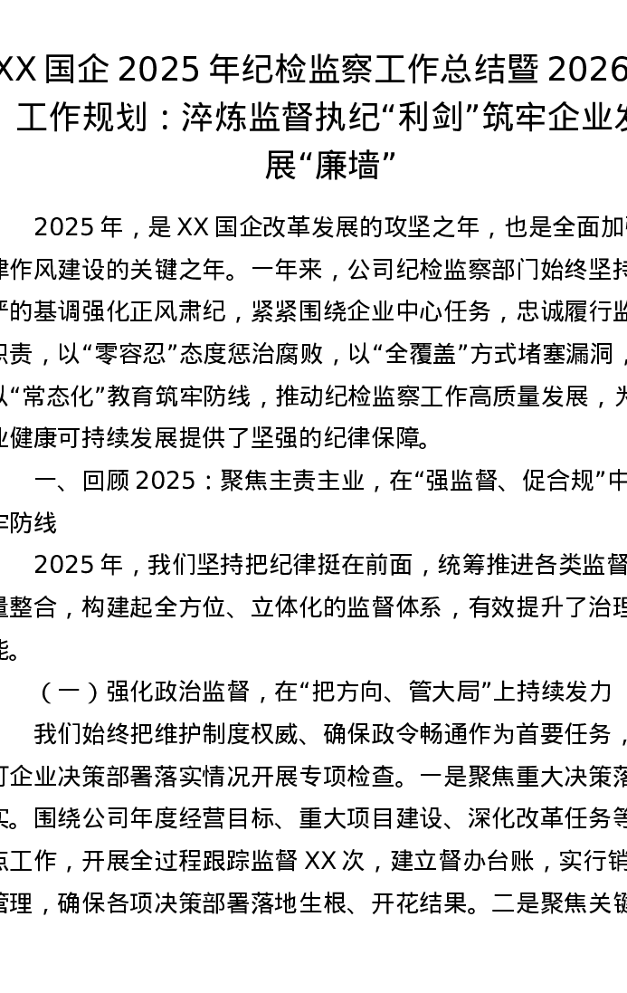 XX国企2025年纪检监察工作总结暨2026年工作规划:淬炼监督执纪“利剑” 筑牢企业发展“廉墙”