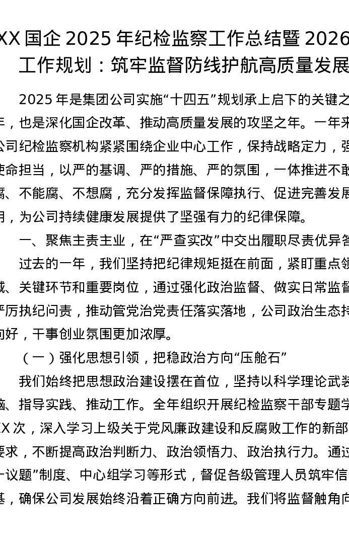 XX国企2025年纪检监察工作总结暨2026年工作规划:筑牢监督防线 护航高质量发展