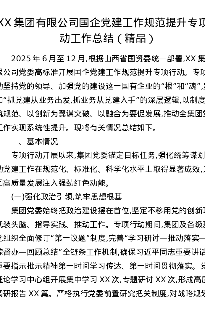 XX集团有限公司国企党建工作规范提升专项行动工作总结