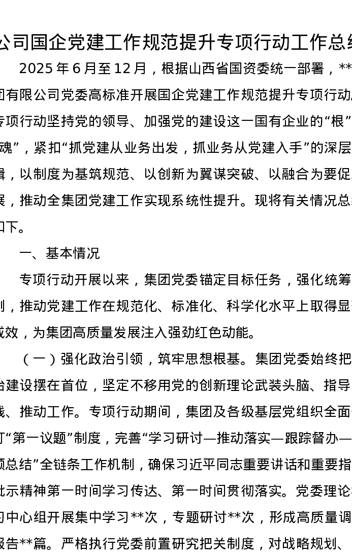 公司国企党建工作规范提升专项行动工作总结