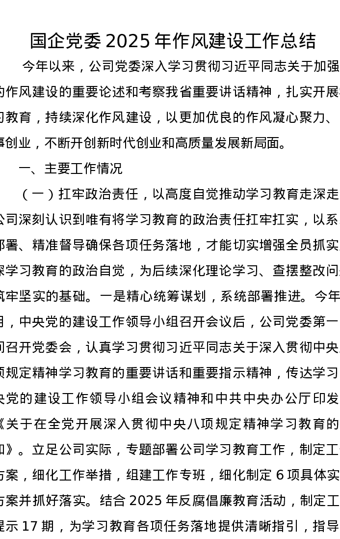 国企党委2025年作风建设工作总结