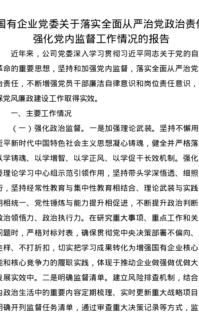 国有企业党委关于落实全面从严治党政治责任强化党内监督工作情况的报告