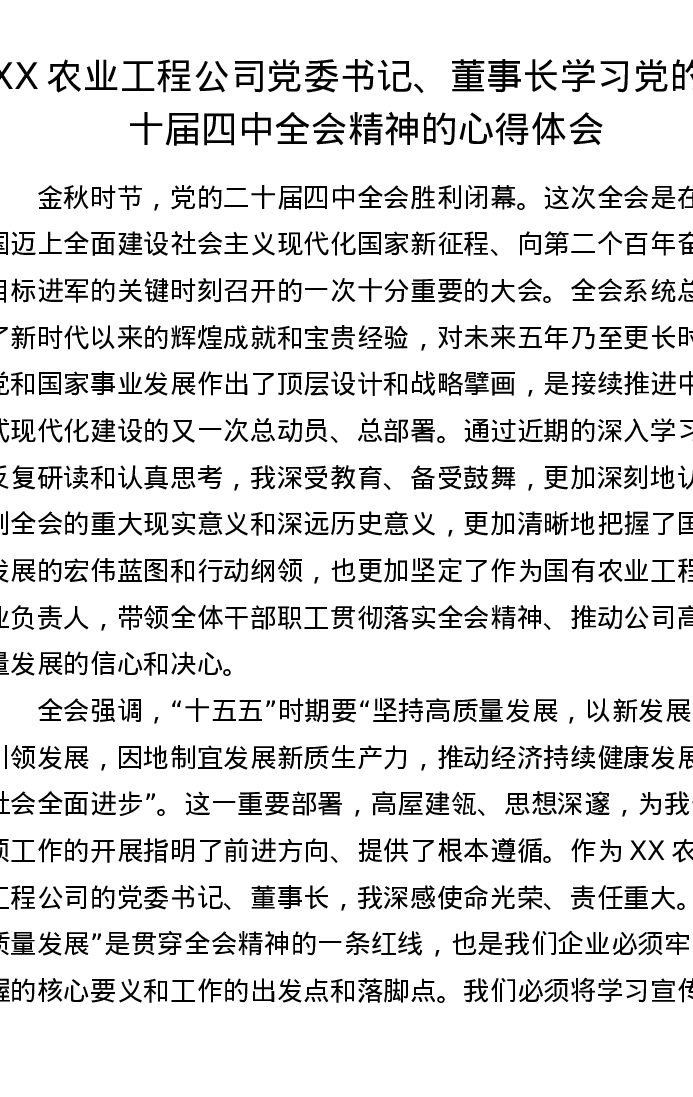 XX农业工程公司党委书记、董事长学习党的二十届四中全会精神的心得体会