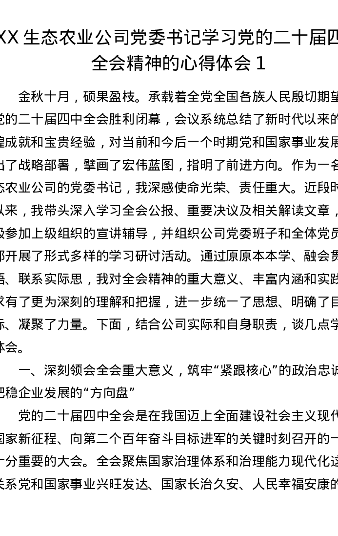 XX生态农业公司党委书记学习党的二十届四中全会精神的心得体会1