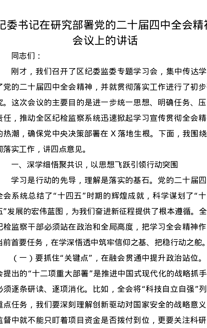 纪委书记在研究部署党的二十届四中全会精神会议上的讲话