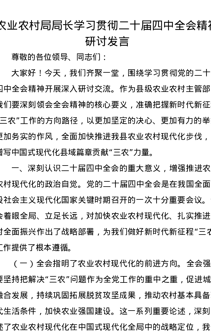 农业农村局局长学习贯彻二十届四中全会精神研讨发言