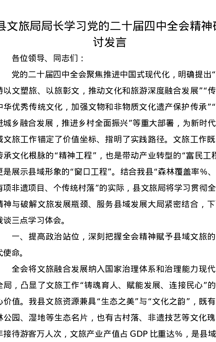 县文旅局局长学习党的二十届四中全会精神研讨发言
