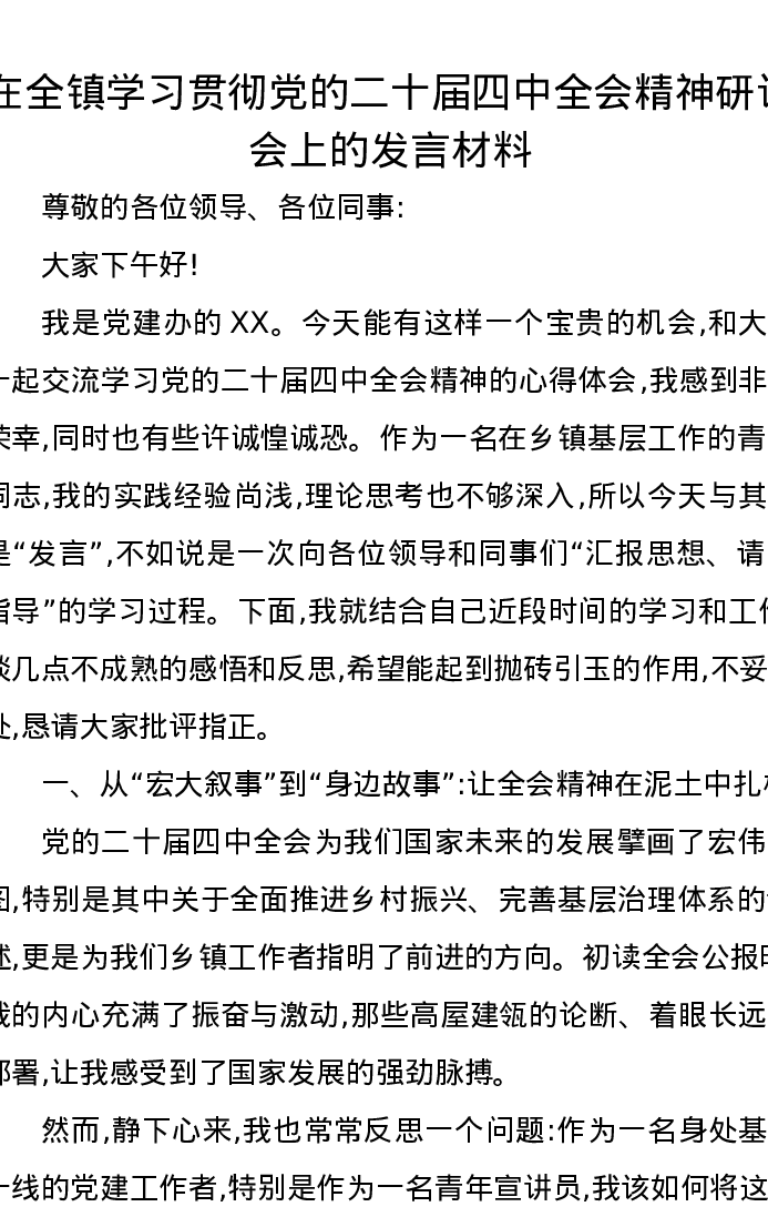 在全镇学习贯彻党的二十届四中全会精神研讨会上的发言材料