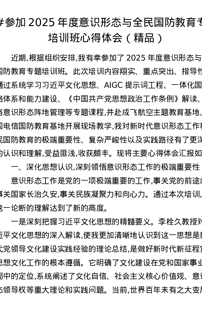 参加2025年度意识形态与全民国防教育专题培训班心得体会