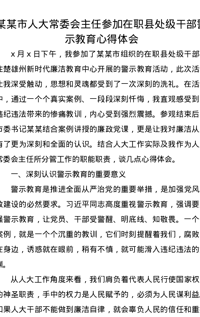 某某市人大常委会主任参加在职县处级干部警示教育心得体会
