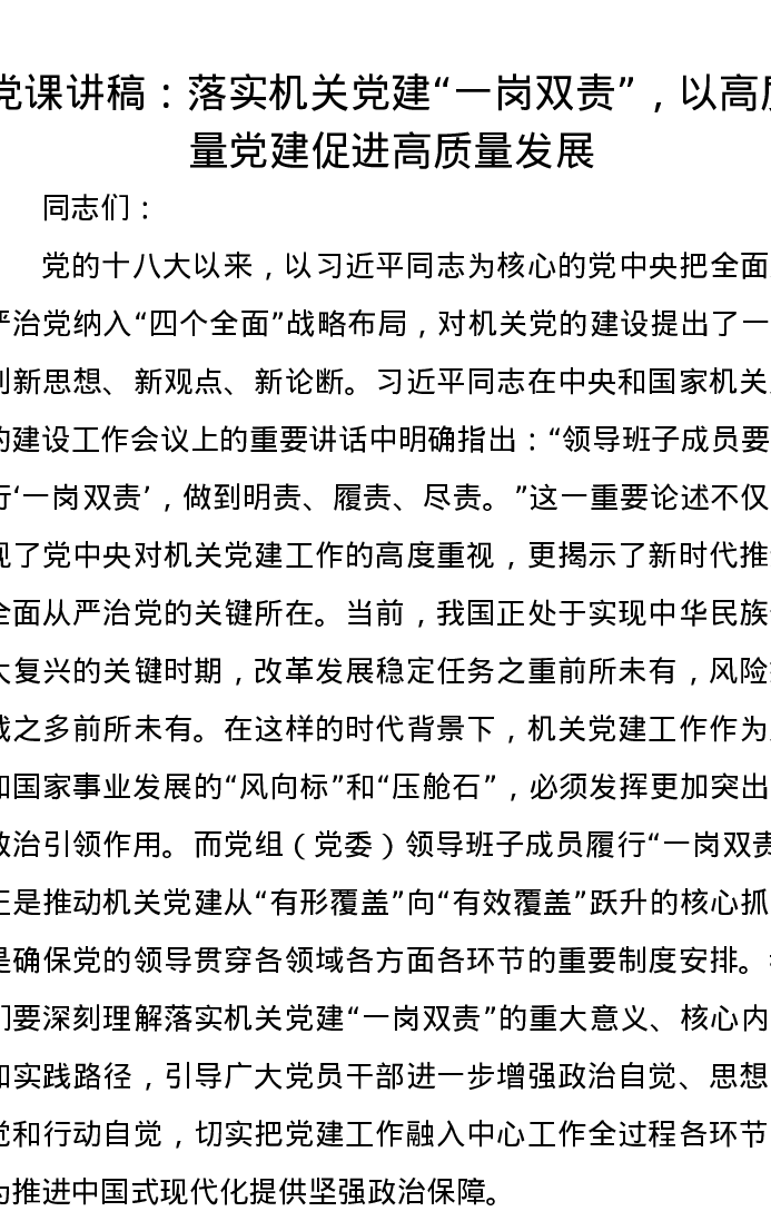 党课讲稿:落实机关党建“一岗双责”,以高质量党建促进高质量发展