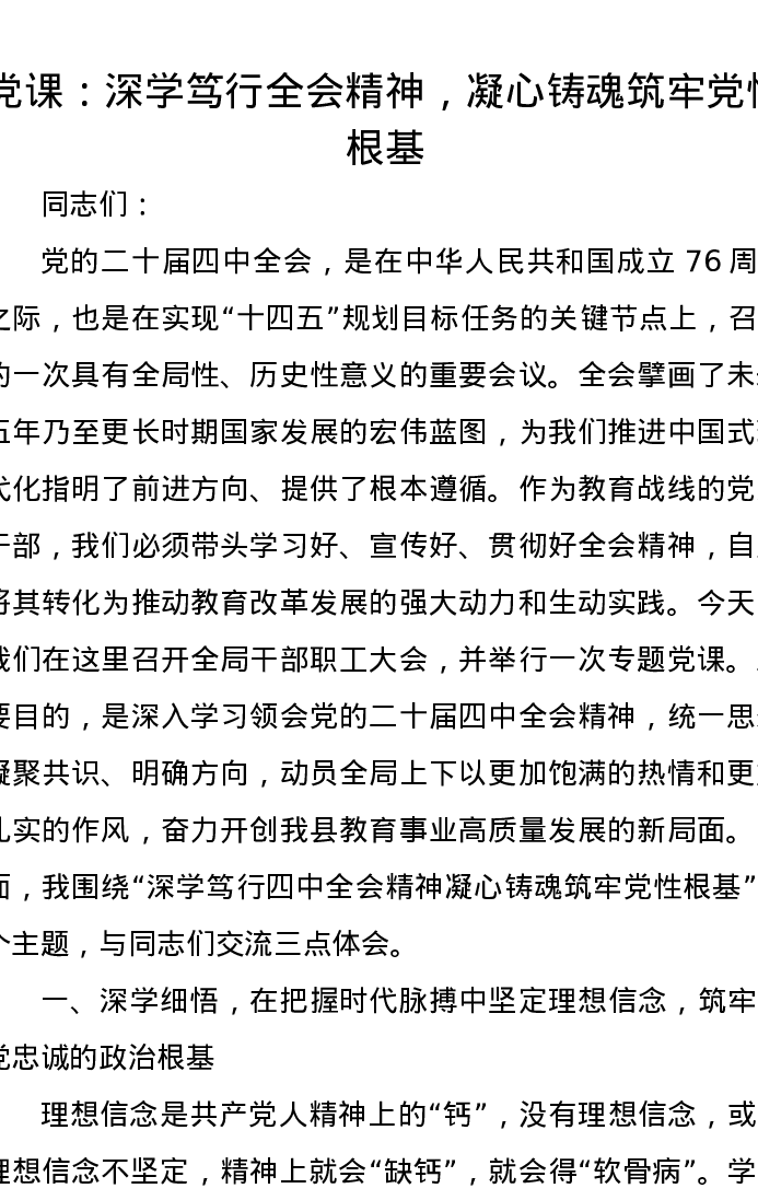 党课讲稿:深学笃行全会精神,凝心铸魂筑牢党性根基