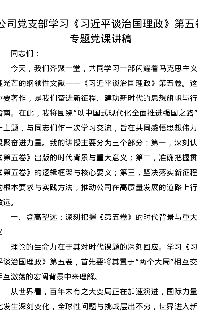 公司党支部学习《习近平谈治国理政》第五卷专题党课讲稿