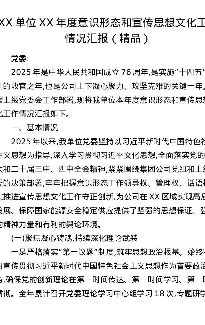 XX单位XX年度意识形态和宣传思想文化工作情况汇报