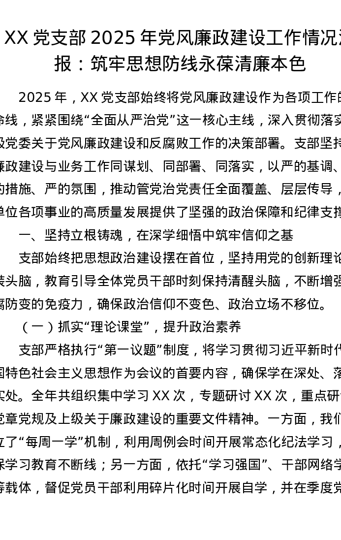 XX党支部2025年党风廉政建设工作情况汇报:筑牢思想防线 永葆清廉本色
