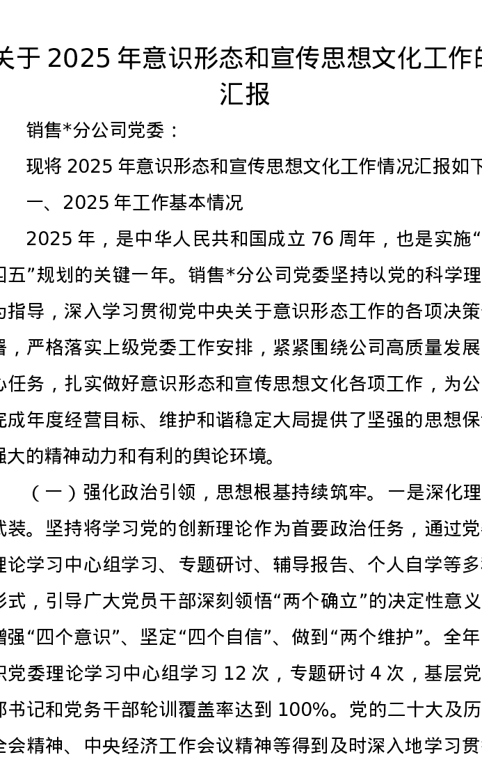 关于2025年意识形态和宣传思想文化工作的汇报