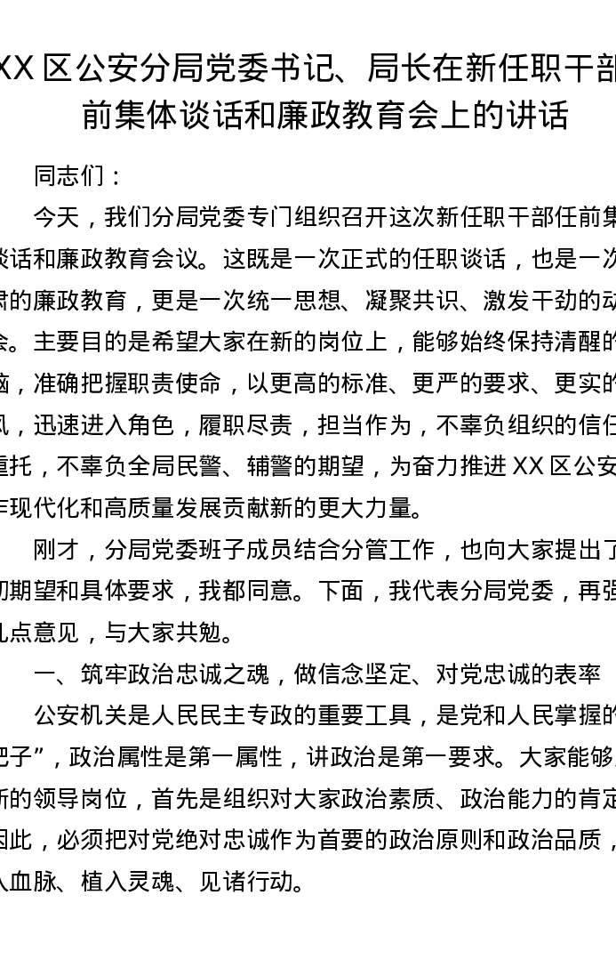 XX区公安分局党委书记、局长在新任职干部任前集体谈话和廉政教育会上的讲话