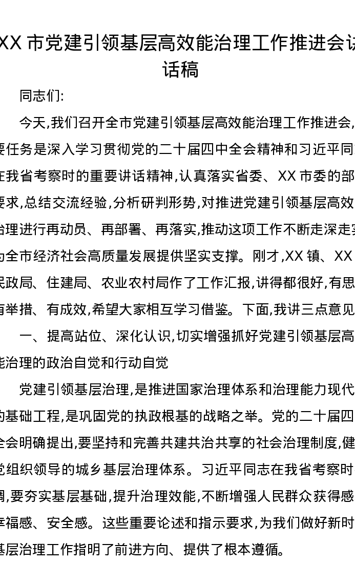 XX市党建引领基层高效能治理工作推进会讲话稿