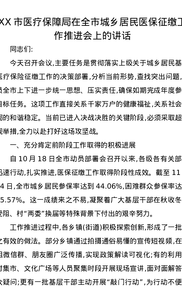 XX市医疗保障局在全市城乡居民医保征缴工作推进会上的讲话