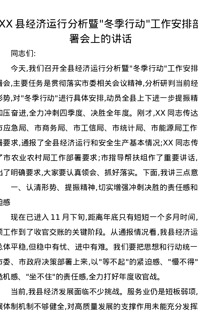 XX县经济运行分析暨冬季行动工作安排部署会上的讲话