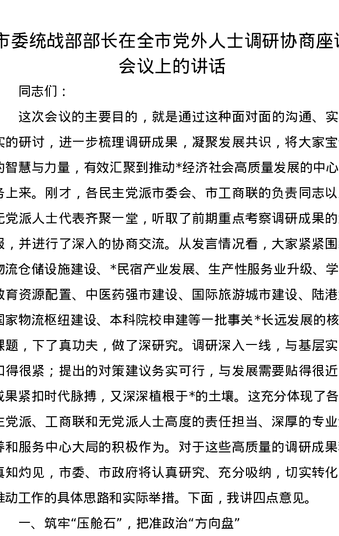 市委统战部部长在全市党外人士调研协商座谈会议上的讲话