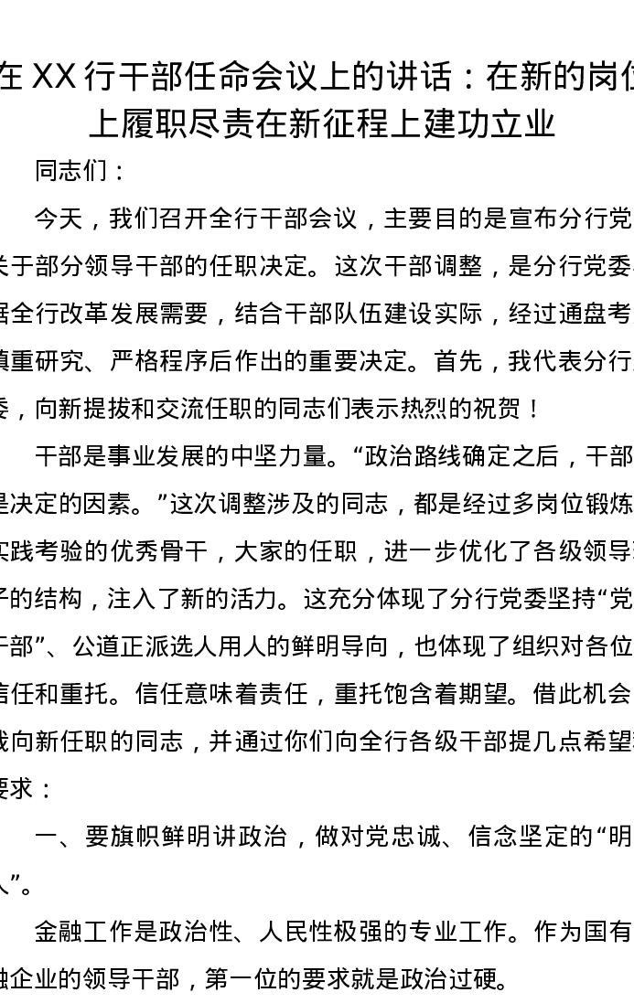 在XX行干部任命会议上的讲话:在新的岗位上履职尽责 在新征程上建功立业