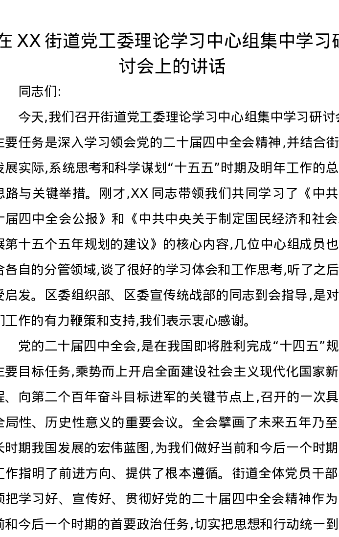 在XX街道党工委理论学习中心组集中学习研讨会上的讲话