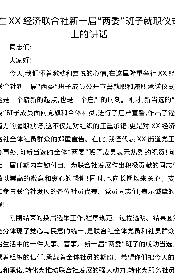 在XX经济联合社新一届“两委”班子就职仪式上的讲话