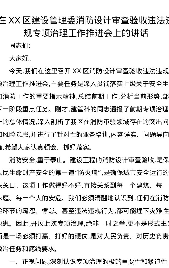 在XX区建设管理委消防设计审查验收违法违规专项治理工作推进会上的讲话