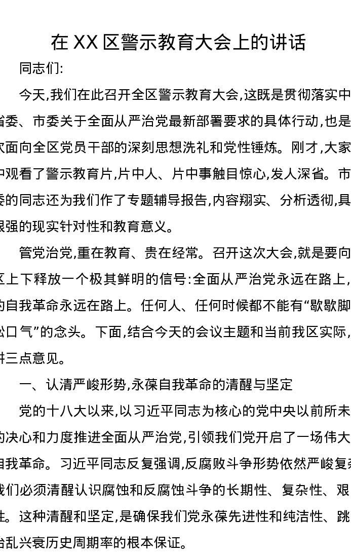 在XX区警示教育大会上的讲话