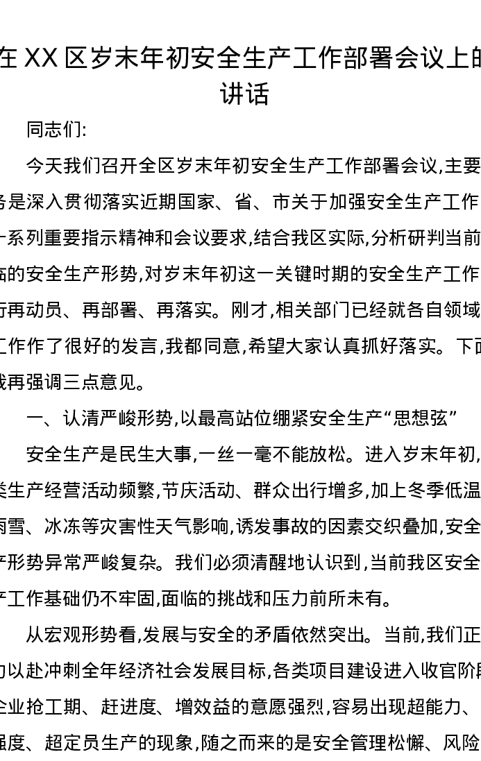 在XX区岁末年初安全生产工作部署会议上的讲话