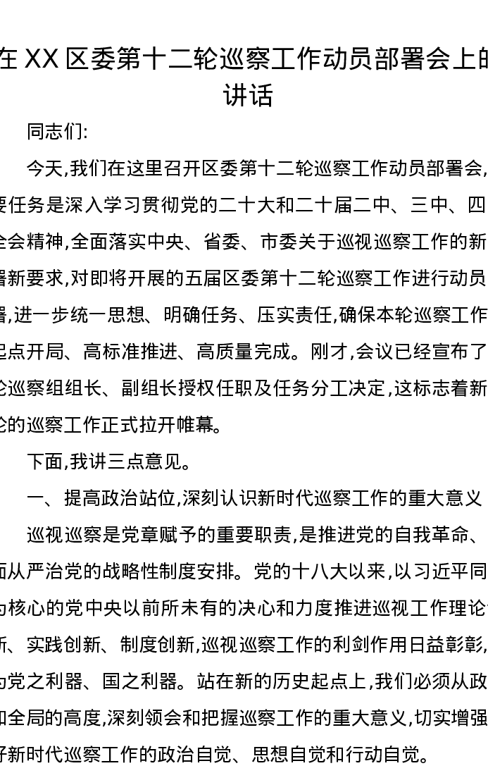 在XX区委第十二轮巡察工作动员部署会上的讲话