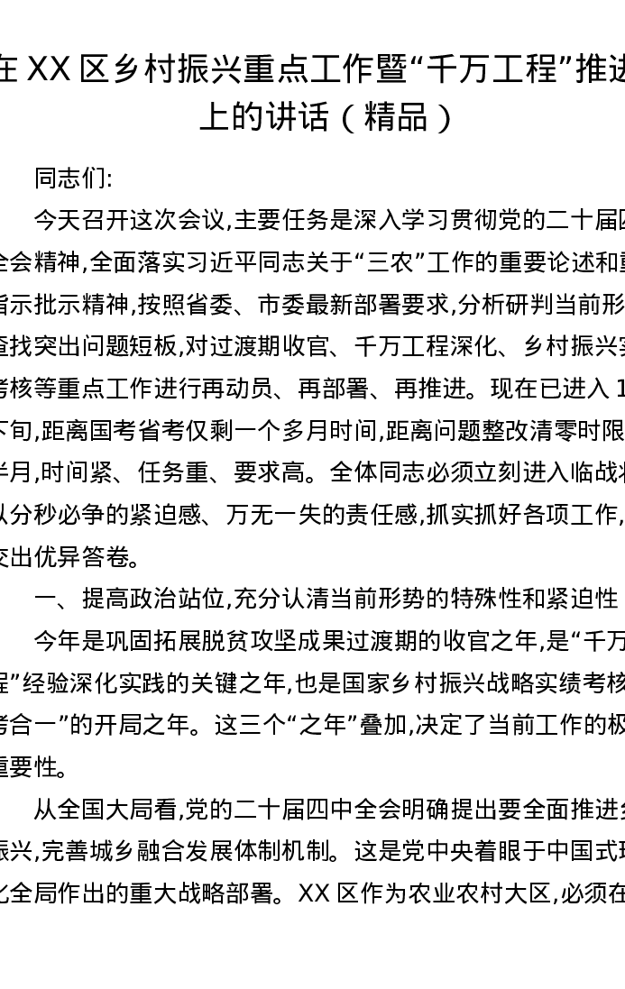 在XX区乡村振兴重点工作暨“千万工程”推进会上的讲话