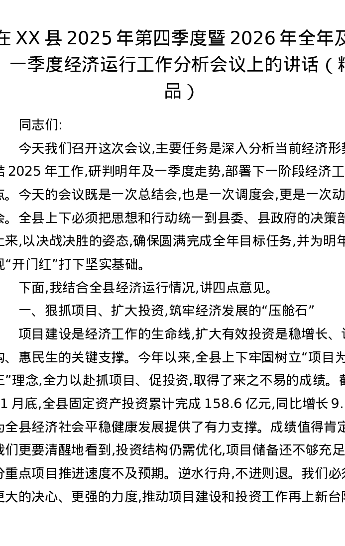 在XX县2025年第四季度暨2026年全年及第一季度经济运行工作分析会议上的讲话
