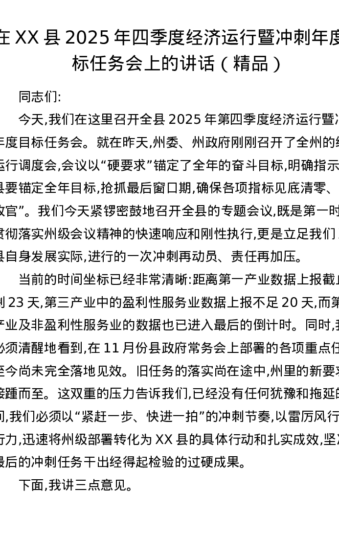 在XX县2025年四季度经济运行暨冲刺年度目标任务会上的讲话