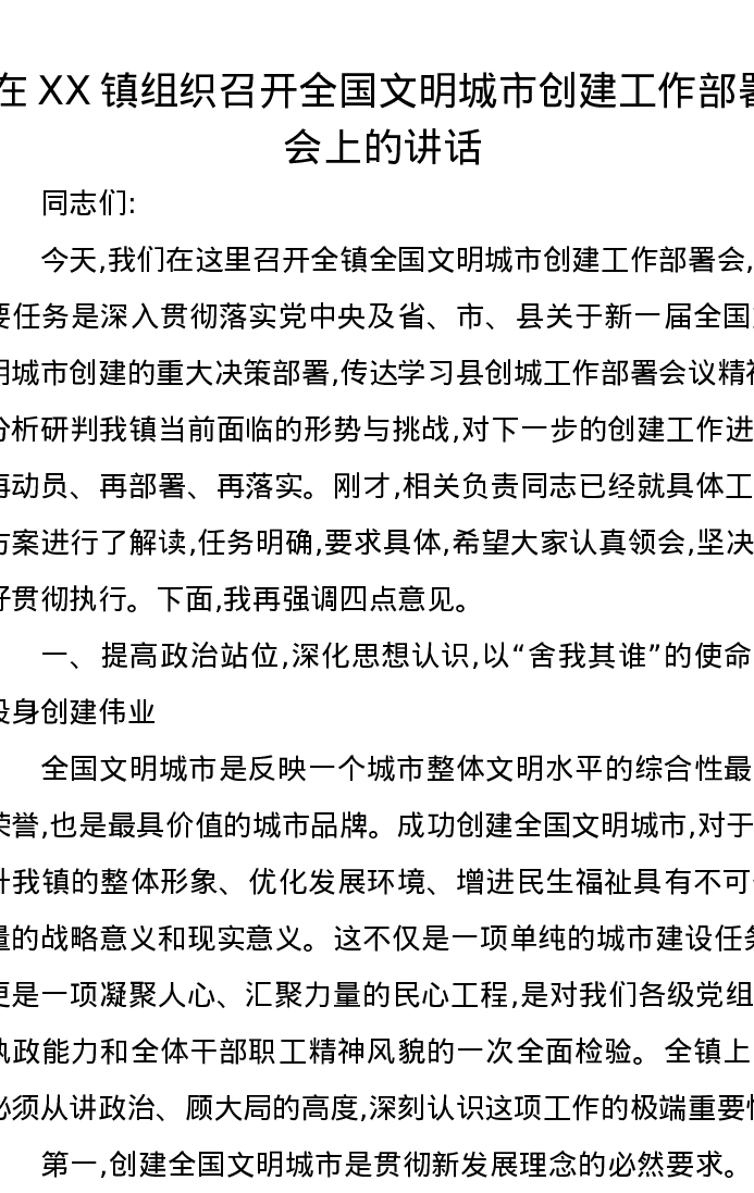在XX镇组织召开全国文明城市创建工作部署会上的讲话
