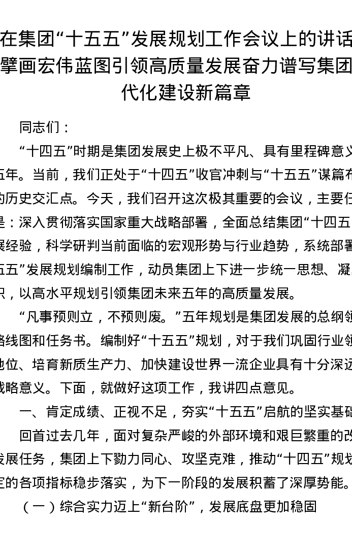 在集团“十五五”发展规划工作会议上的讲话:擘画宏伟蓝图 引领高质量发展 奋力谱写集团现代化建设新篇章