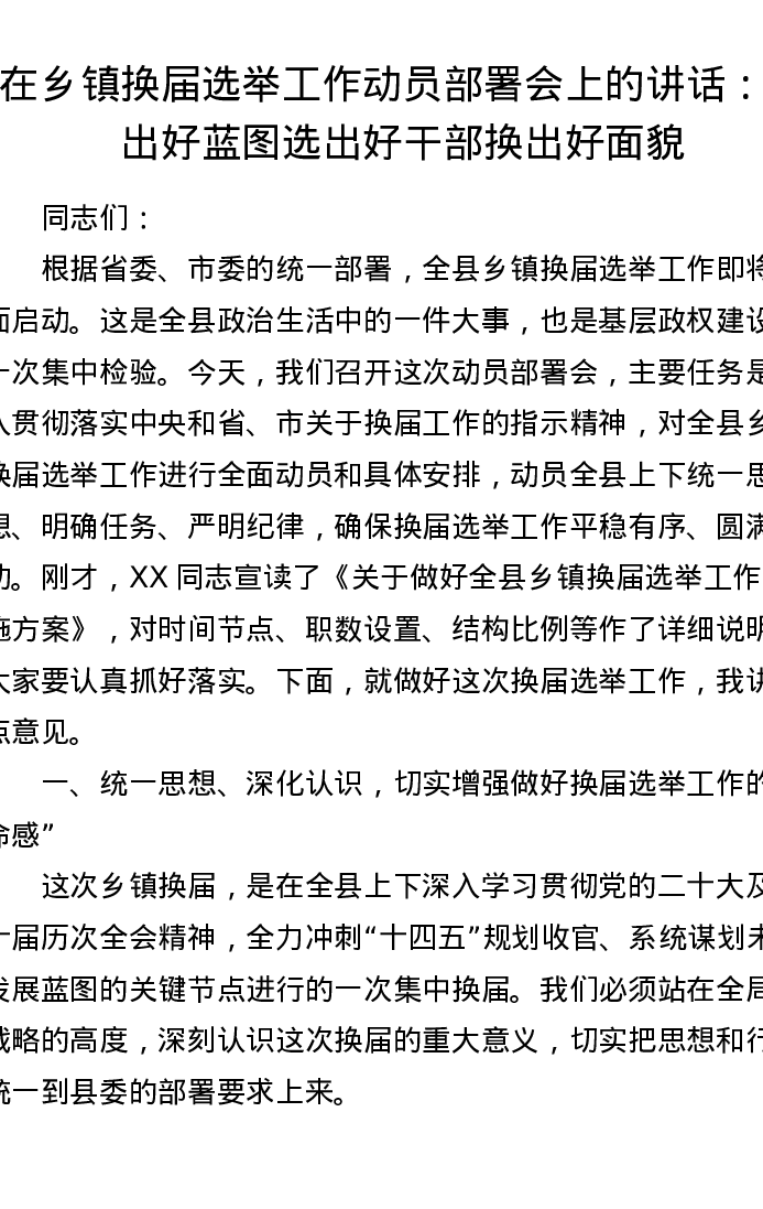 在乡镇换届选举工作动员部署会上的讲话:绘出好蓝图 选出好干部 换出好面貌