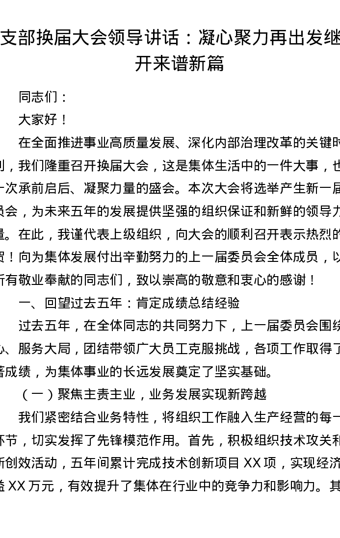 支部换届大会领导讲话:凝心聚力再出发 继往开来谱新篇