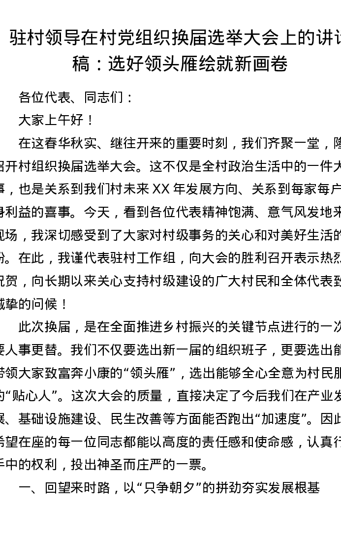 驻村领导在村党组织换届选举大会上的讲话稿:选好领头雁 绘就新画卷