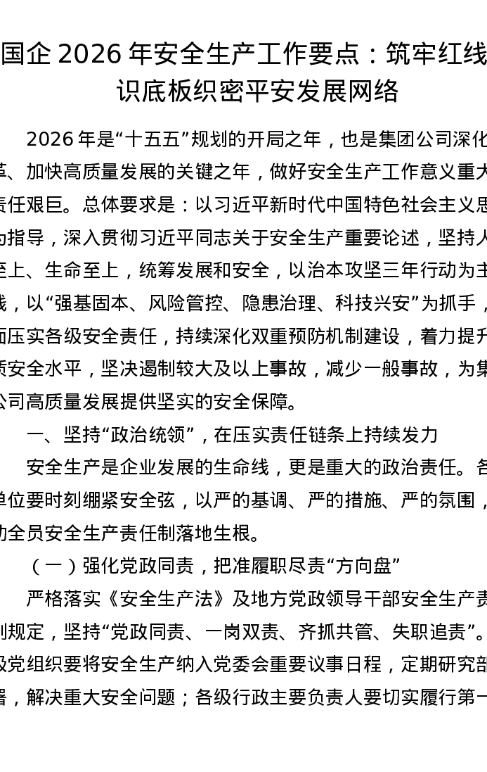 国企2026年安全生产工作要点:筑牢红线意识底板 织密平安发展网络