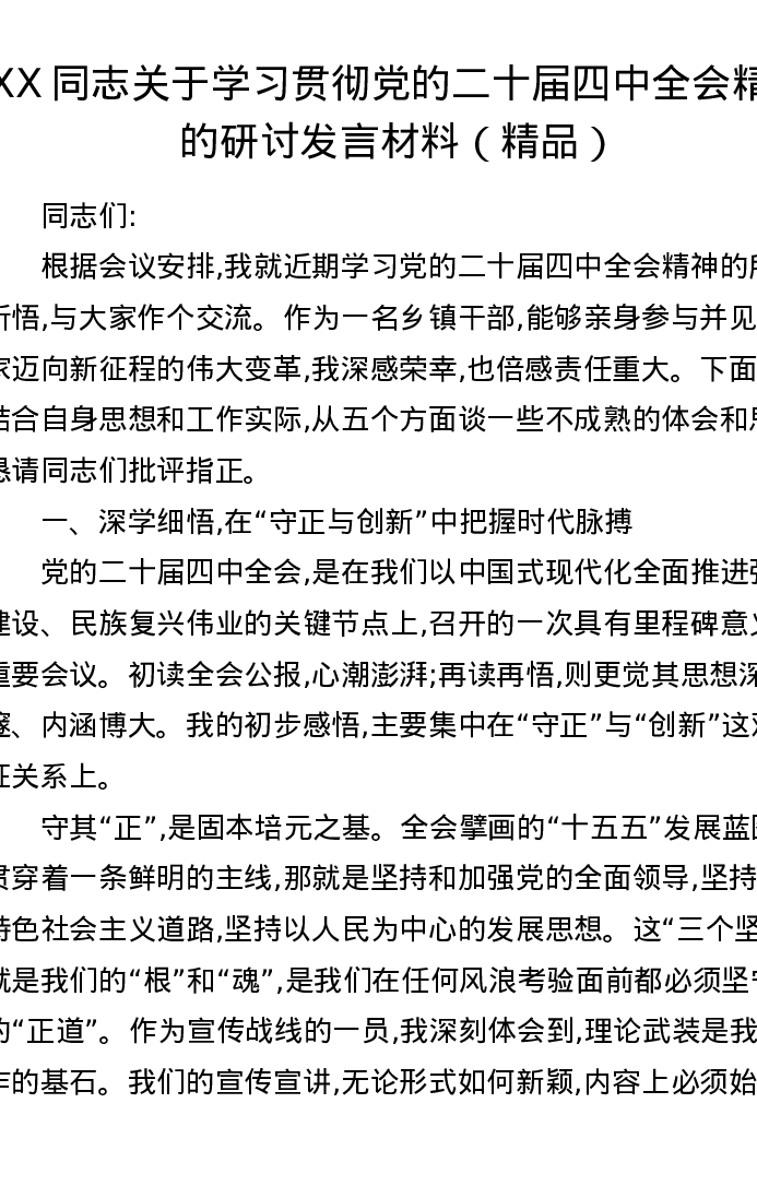 XX同志关于学习贯彻党的二十届四中全会精神的研讨发言材料