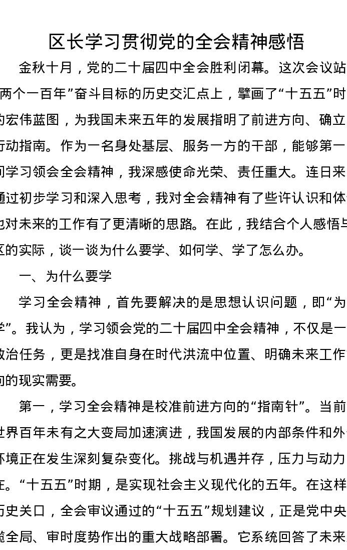 区长学习贯彻党的二十届四中全会精神感悟