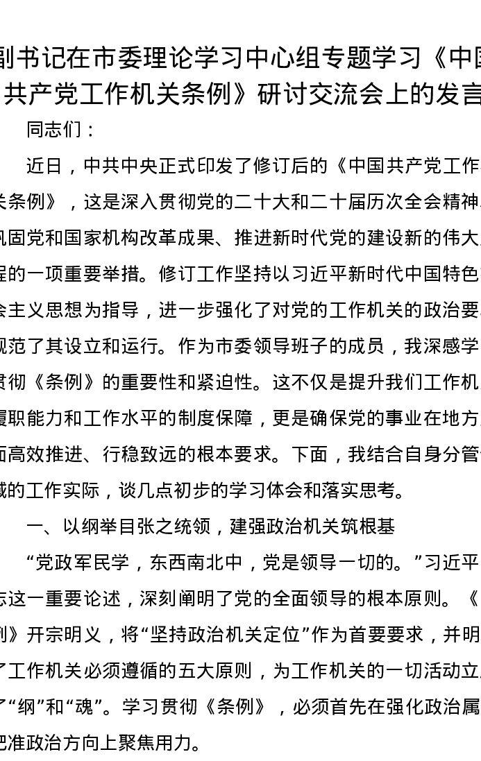 副书记在市委理论学习中心组专题学习《中国共产党工作机关条例》研讨交流会上的发言