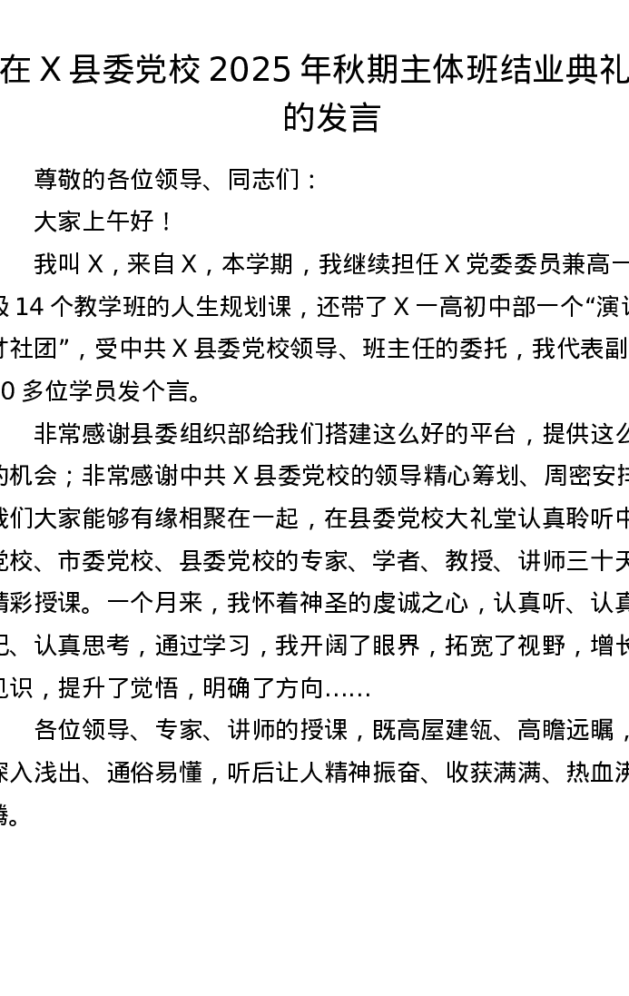 在X县委党校2025年秋期主体班结业典礼上的发言