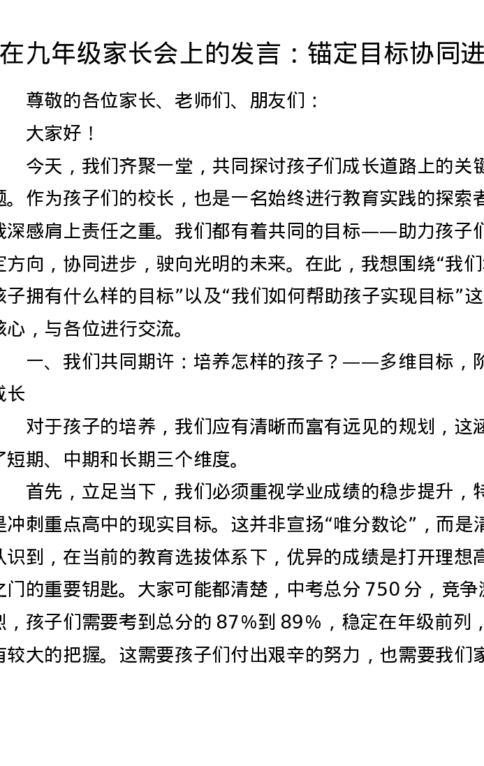 在九年级家长会上的发言:锚定目标协同进步