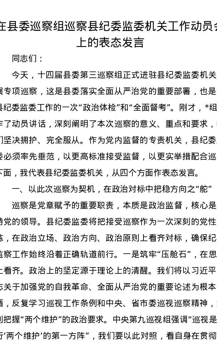 在县委巡察组巡察县纪委监委机关工作动员会上的表态发言