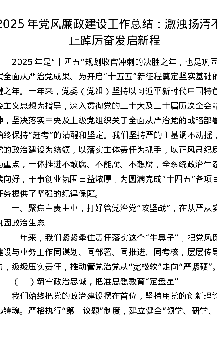 2025年党风廉政建设工作总结:激浊扬清不仅止 踔厉奋发启新程